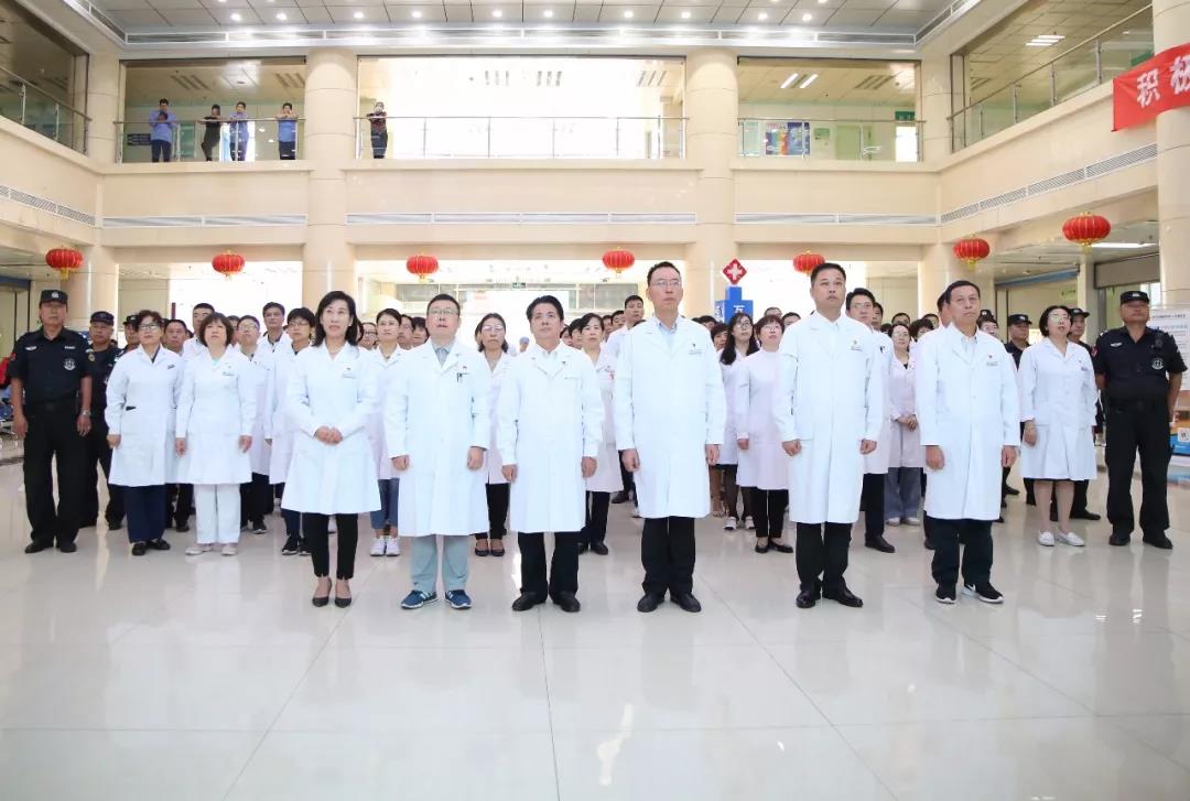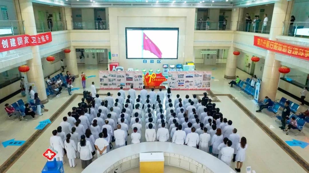 当日,秋高气爽,阳光明媚。参加国庆活动的医院党员干部职工在河北省胸科医院门诊大厅集合,列队参加升国旗、唱国歌仪式。