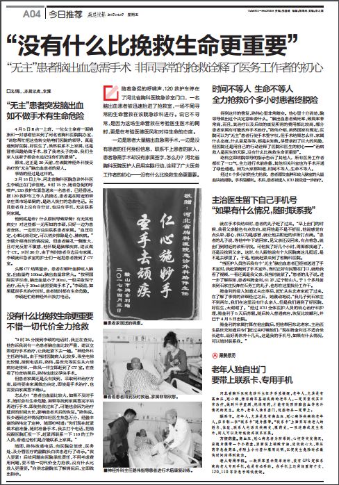 燕赵晚报整版报道我院救治“无主”大量脑出血患者